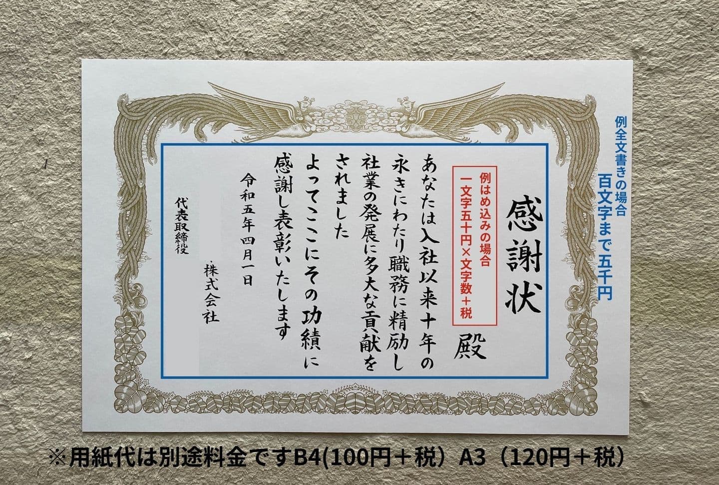 | 材料費 | 別途料金(賞状用紙、筒、額など) |